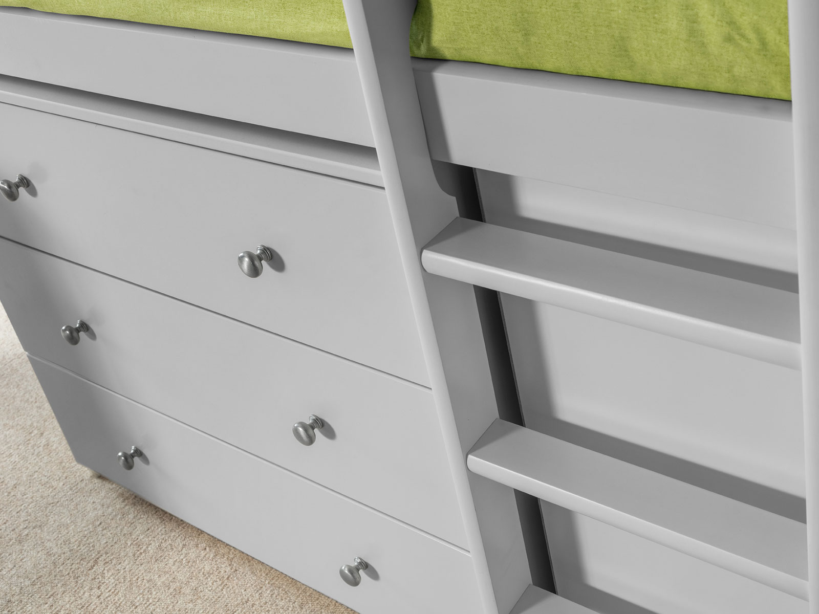 Roxy is an extremely clever and practical piece of children's furniture that offers incredible functionality and great value for money. Roxy's compact footprint is supported by a robust, solid pine framed construction and offers numerous useful features from a handy pull-out desk to ample shelving and cupboard space. Immaculately finished in a smooth dove grey lacquer, Roxy comes with two choices of handle in either traditional painted wood, or a contemporary brushed steel finish. Roxy is also available in Stone White